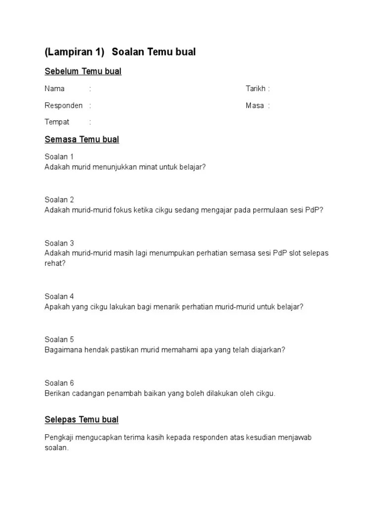 Contoh skrip temu bual orang sumber (lampiran) nama : Interview report example contoh laporan temu bual peranan guru sebagai pemimpin profesional dalam pelbagai aspek pembelajaran dan pemudahcaraan muhammad al. Penyelidik percaya bahawa pendekatan kajian kes ini sesuai dijalankan dikalangan enam orang pelajar. Boleh tuan ceritakan serba sedikit latar belakang diri tuan khususnya sebagai pekerja . ٢٢ جمادى الأولى ١٤٣٨ هـ.